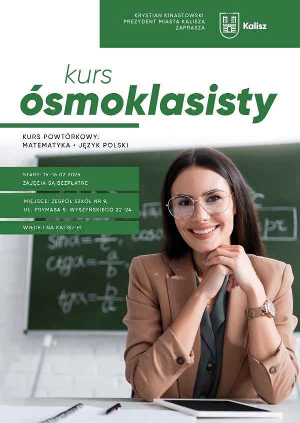 Wzorem lat ubiegłych Miasto Kalisz proponuje młodzieży kaliskich szkół podstawowych dodatkowe, nieodpłatne, zajęcia z matematyki i języka polskiego. Będą stanowiły powtórzenie przed egzaminem ósmoklasisty. Każdy ósmoklasista może wybrać jeden przedmiot lub dwa, w zależności od potrzeb. Zajęcia – 2 godziny lekcyjne z danego przedmiotu – odbywać się będą na terenie Zespołu Szkół nr 9 przy ul. Prymasa S. Wyszyńskiego 22-24 w weekendy: 15 -16.02, 8 -9.03, 29 -30.03, 12 -13.04. (8 spotkań z każdego przedmiotu). Wszystkie zajęcia są bezpłatne i dedykowane tylko uczniom klas ósmych z kaliskich szkół podstawowych - publicznych i niepublicznych .