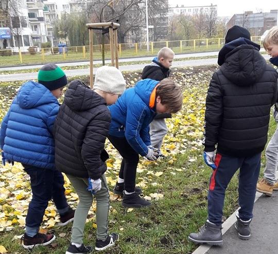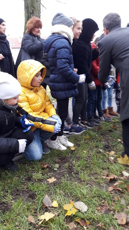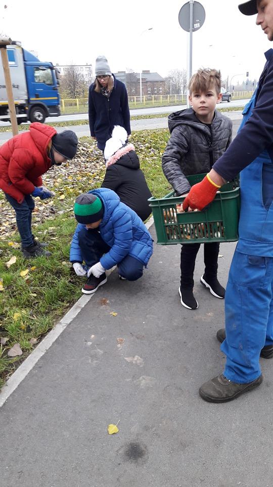 15 listopada uczniowie z klasy 4a i 4b wspólnie z wiceprezydentami miasta Kalisza – p. Grzegorzem Kulawinkiem, p. Mateuszem Podsadnym oraz p. Janem Kłyszem - naczelnikiem Wydziału Gospodarki Komunalnej i Ochrony Środowiska Urzędu Miasta Kalisza, sadzili cebulki kwiatów w parku przy Galerii Amber.