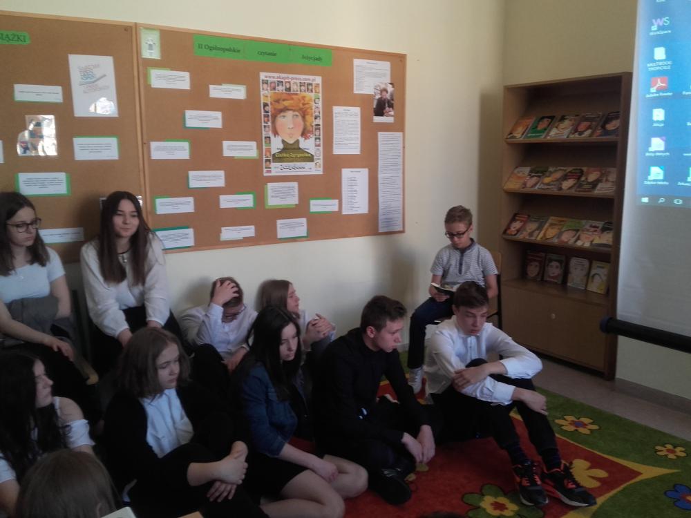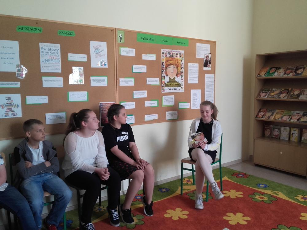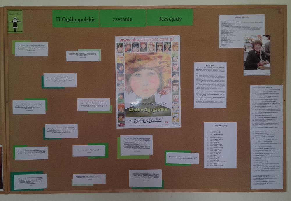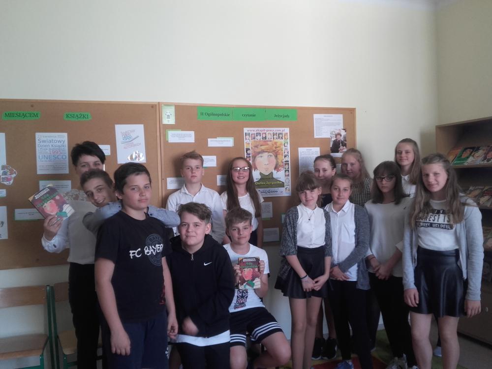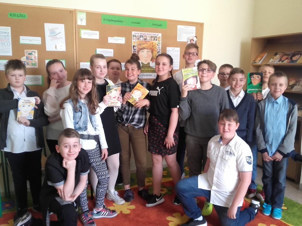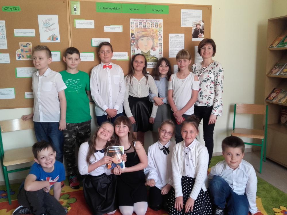W akcji wzięli udział uczniowie klasy 4b, 5b, 6c, 7c oraz II d gimnazjum. Uczestnicy akcji obejrzeli wywiad z Małgorzatą Musierowicz, dzięki któremu bliżej poznali autorkę. Młodsi uczniowie dowiedzieli się, co to jest Jeżycjada. Uczestnicy poznali fragmenty wybranych tomów m.in. "Opium w rosole", "Ida sierpniowa", "Kwiat kalafiora". Uczniowie klasy II gimnazjum otrzymali losowo wybrane książki, ich zadanie polegało na wyszukaniu interesującego ich fragmentu i przeczytaniu go koleżankom i kolegom. Uczniowie zapoznali się z najnowszym 22 tomem, czyli utworem pt."Ciotka Zgryzotka". W bibliotece opracowana została gazetka przestawiająca krótko sylwetkę Małgorzaty Musierowicz oraz zdobyte przez nią nagrody. Umieszczone zostały tam także cytaty z różnych tomów Jeżycjady. Przygotowano też wystawę całego cyklu, który znajduje się w naszych zbiorach. Spotkanie zaowocowało kilkoma wypożyczeniami książek z cyklu o rodzinie Borejków.