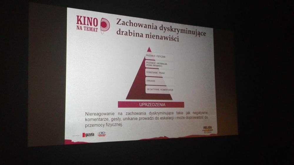 Uczniowie obejrzeli głośny film pt. "Cudowny chłopak", co było doskonałym pretekstem do rozmów na temat dyskryminacji. Po zakończonym seansie prowadząca opowiedziała młodzieży o przyczynach powstania filmu, a następnie poprowadziła bardzo ciekawą rozmowę na temat przyczyn i mechanizmów odrzucenia, które dotyka młodzież w grupie rówieśniczej.