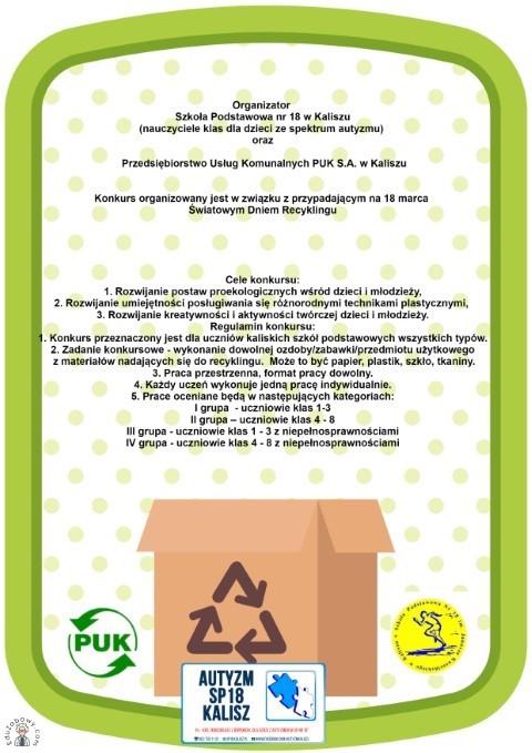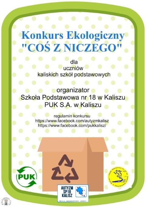 Zapraszamy uczniów kaliskich szkół podstawowych do udziału w konkursie ekologicznym pod hasłem "Coś z niczego". Patronat nad konkursem objęło Przedsiębiorstwo Usług Komunalnych PUK S.A. w Kaliszu. Zdjęcia prac można nadsyłać do 6 marca indywidualnie lub poprzez placówkę ucznia. Prosimy o zapoznanie się z regulaminem konkursu. Szczegóły w załączniku.