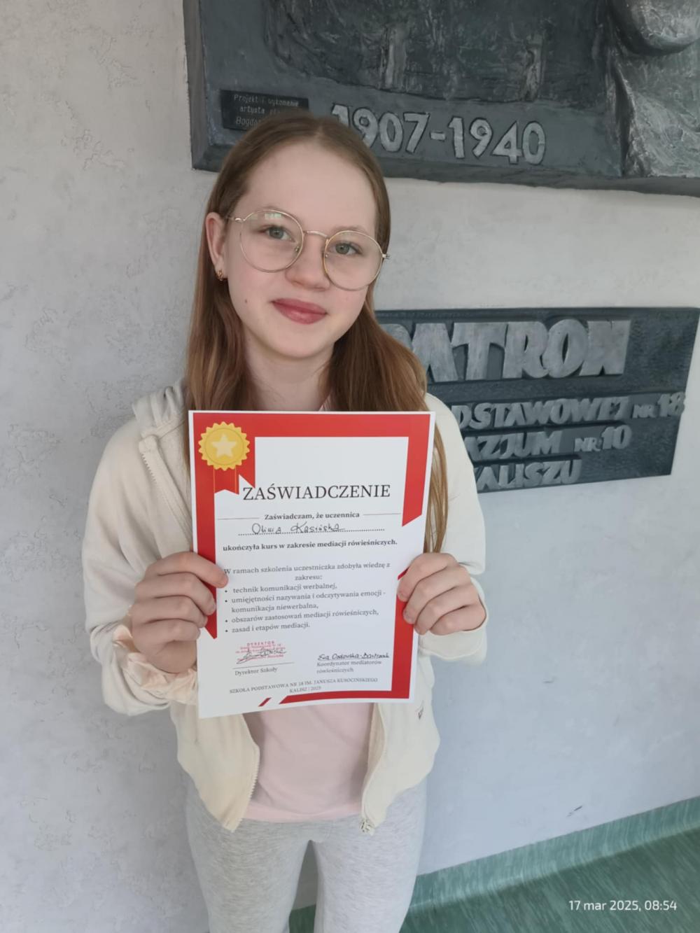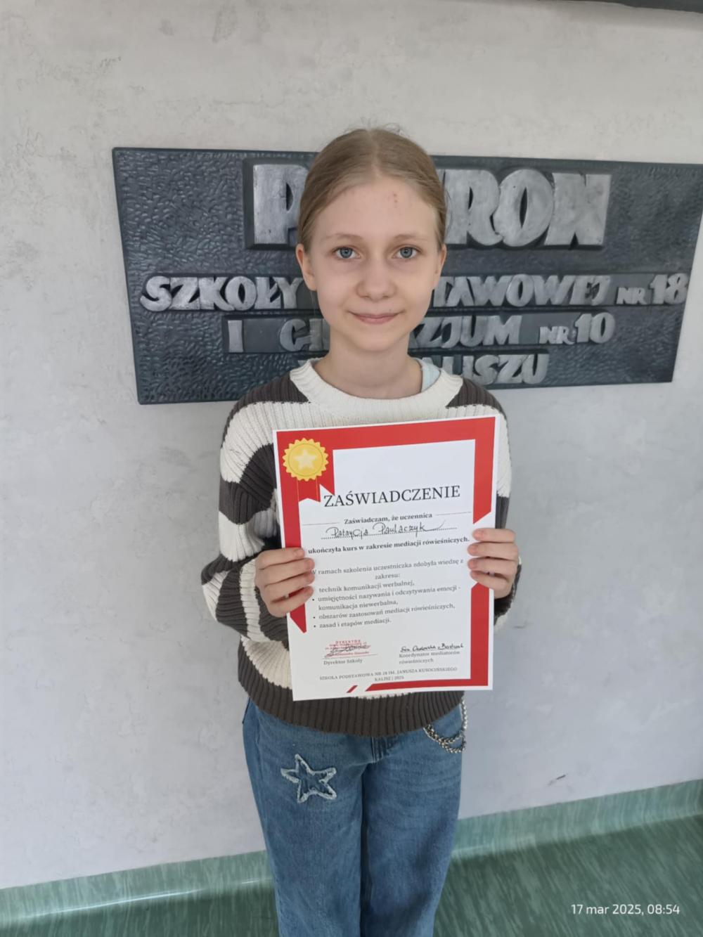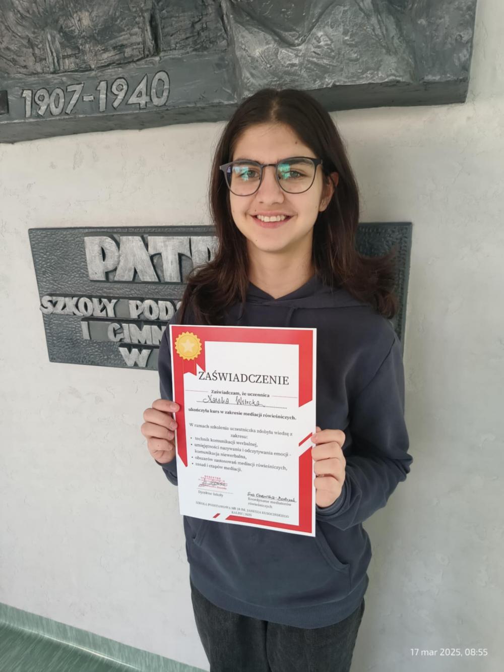Pani wicedyrektor Dorota Paszek pogratulowała dziewczynom zdobycia umiejętności, ale przede wszystkim zaangażowania i chęci pomagania zwaśnionym stronom.