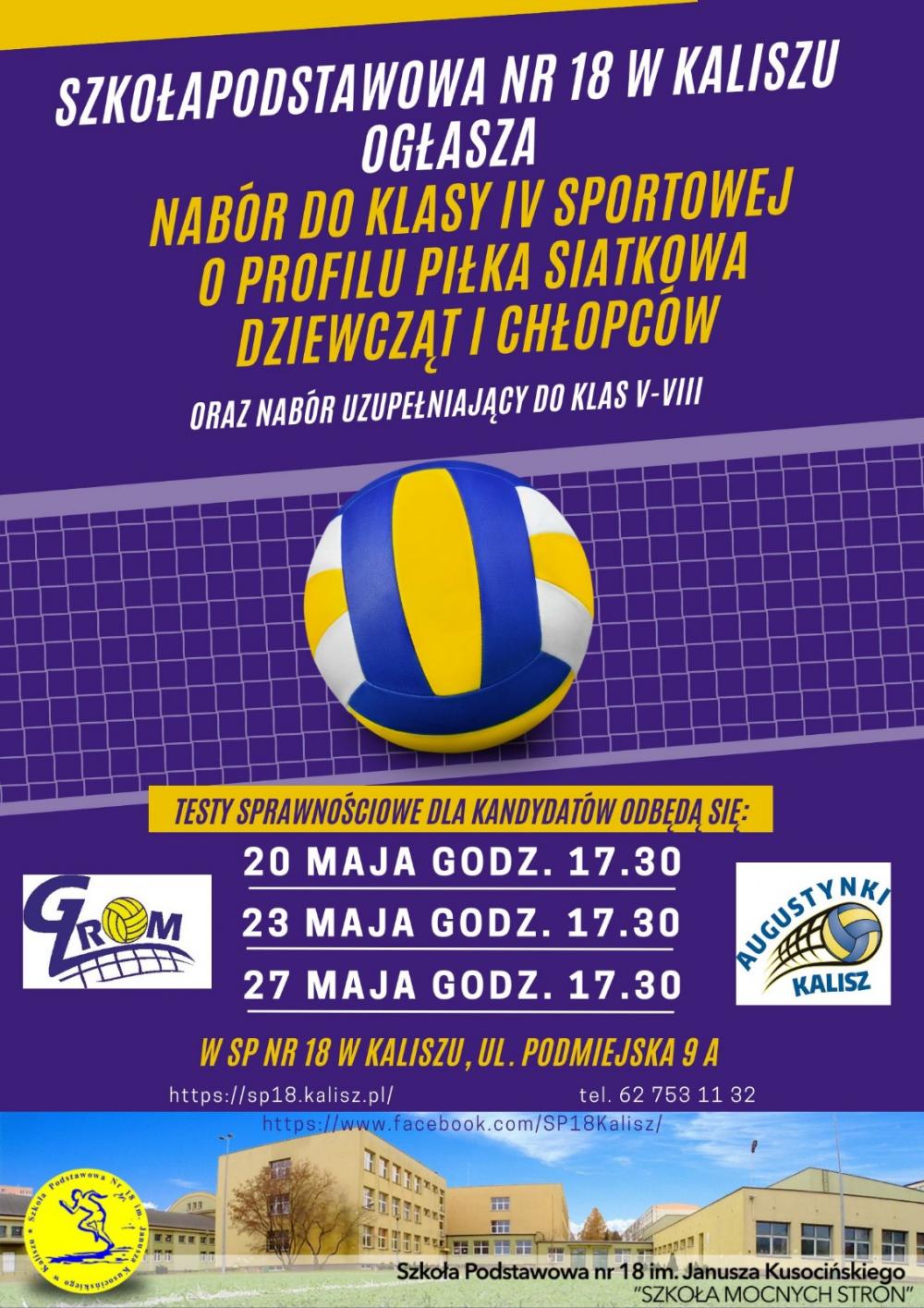 Szkoła Podstawowa nr 18 w Kaliszu ogłasza nabór do klasy IV sportowej o profilu piłka siatkowa dziewcząt i chłopców oraz nabór uzupełniający do klas V - VIII