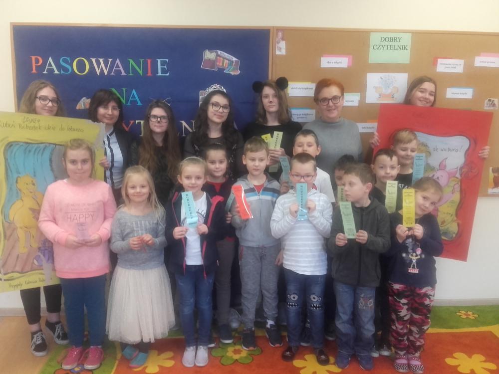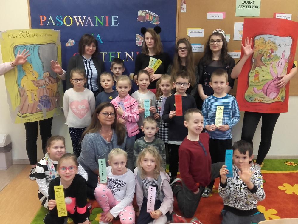 W dniach 25 i 26 stycznia uczniowie klas pierwszych naszej szkoły zostali uroczyście przyjęci w poczet czytelników Biblioteki Szkolnej. Pierwszaki odwiedziły bibliotekę gdzie czekały na nich postacie z bajki oraz książki nowa i zniszczona. W trakcie gier i zabaw uczniowie zostali wprowadzeni w świat bajek oraz poznali prawa i obowiązki czytelnika. Po uroczystym złożeniu przyrzeczenia i pasowaniu milusińscy wypożyczyli pierwszą książkę. Na pamiątkę tego wydarzenia każde dziecko otrzymało zakładkę do książki. Serdecznie zapraszamy wszystkich uczniów do korzystania ze zbiorów naszej biblioteki!