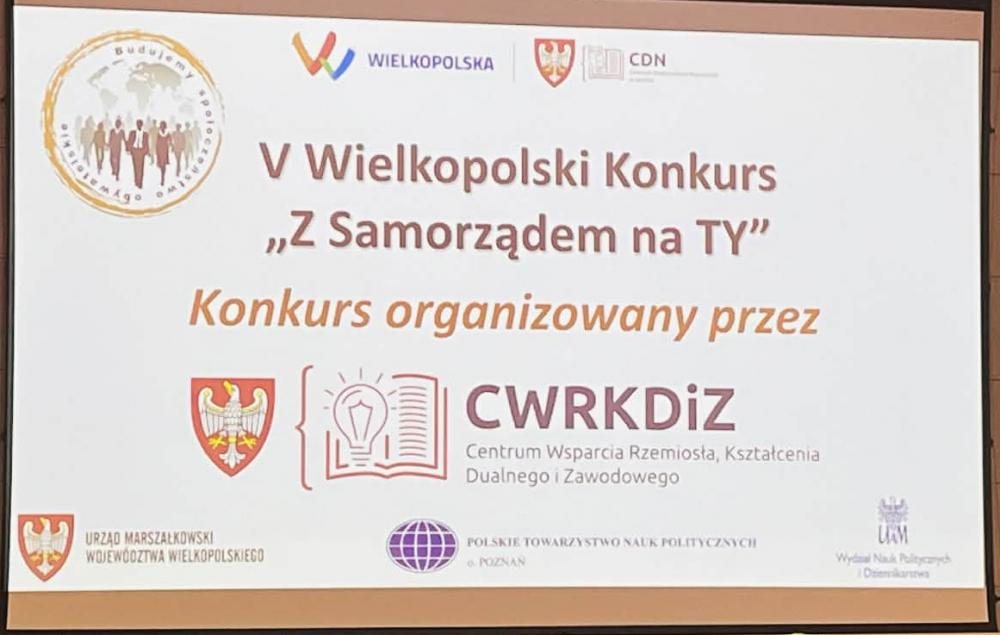 21 listopada 2025 r. w budynku Urząd Marszałkowski Województwa Wielkopolskiego w Poznaniu odbył się finał V edycji konkursu “Z Samorządem na Ty” organizowanego przez Centrum Wsparcia Rzemiosła, Kształcenia Dualnego i Zawodowego w Kaliszu Centrum Wsparcia Rzemiosła, Kształcenia Dualnego i Zawodowego w Koninie Centrum Wsparcia Rzemiosła, Kształcenia Dualnego i Zawodowego w Lesznie Centrum Wsparcia Rzemiosła, Kształcenia Dualnego i Zawodowego w Pile Centrum Wsparcia Rzemiosła, Kształcenia Dualnego i Zawodowego w Poznaniu w partnerstwie z Towarzystwo Samorządowe z Konina, pod Honorowym Patronatem Marszałka Województwa Wielkopolskiego Pana Marek Woźniak oraz Wielkopolskiego Kuratora Oświaty Pana dra Igora Bykowskiego Kuratorium Oświaty w Poznaniu.
