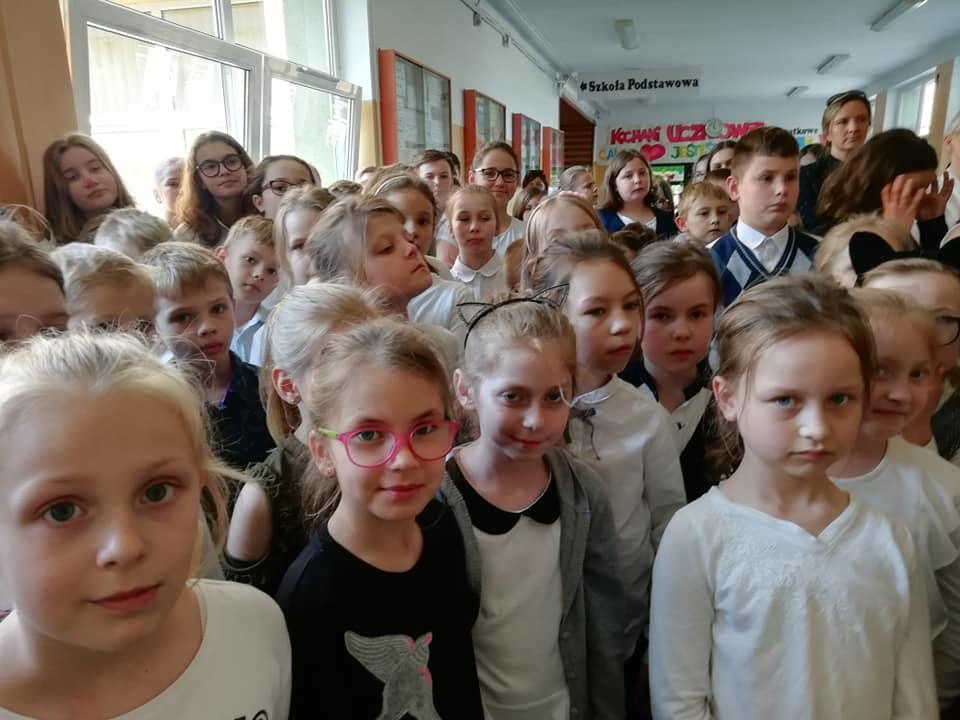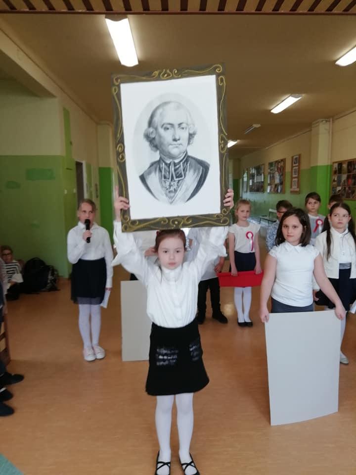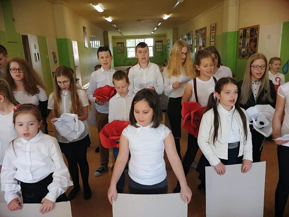 Następnie uczniowie klas 4a, 4b, 4c i 4d oraz chór szkolny przedstawili część artystyczną zatytułowaną "Lekcja konstytucji", a na koniec mogliśmy podziwiać cudowny występ najmłodszych artystów - uczniów klasy IIb.