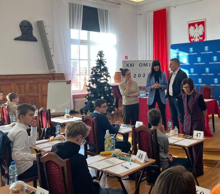 Dnia 10 stycznia 2026r uczeń klasy 8D’ Wojciech Marszał uczestniczył w Olimpiadzie Matematycznej Juniorów (OMJ) drugiego stopnia. To olimpiada przedmiotowa skierowana do wszystkich uczniów szkół podstawowych w Polsce. Jej celem jest rozbudzanie zamiłowania do matematyki wśród młodzieży szkół podstawowych, wyszukiwanie i integracja uczniów zainteresowanych matematyką, kształtowanie umiejętności samodzielnego zdobywania wiedzy oraz stymulowanie aktywności poznawczej młodzieży uzdolnionej. Zawody Olimpiady Matematycznej Juniorów są trójstopniowe. Zakres wiedzy wymaganej na poszczególnych etapach określa program merytoryczny. Zadania konkursowe są nieszablonowe, wymagają od uczestników umiejętności rozumowania i przedstawiania poprawnej argumentacji.