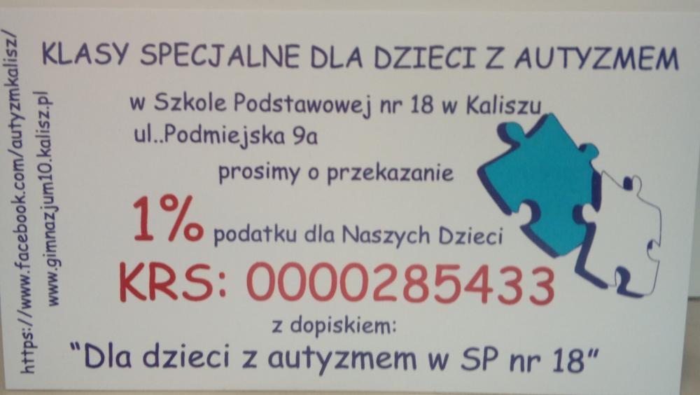 Prosimy o przekazywanie 1% z podatku na rzecz dzieci z autyzmem. Numer KRS 0000285433 z dopiskiem "Dla dzieci z autyzmem w Sp 18 w Kaliszu". Dziękujemy z a wsparcie.