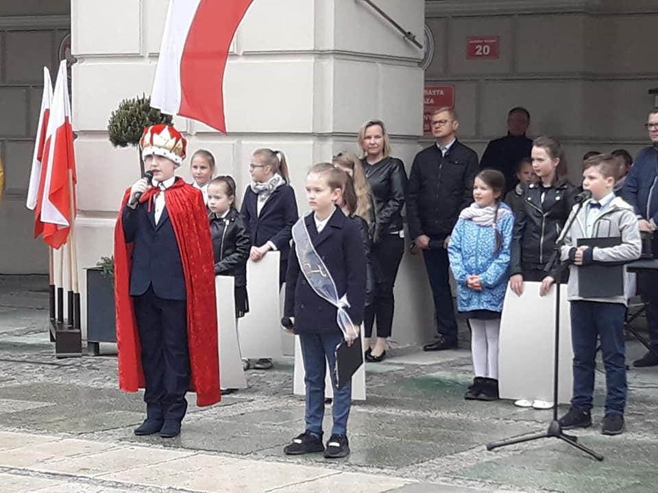 Zebrani na placu kaliszanie wysłuchali przemówienia wiceprezydenta miasta – pana Grzegorza Kulwainka, a następnie podziwiali przepiękny występ dzieci i młodzieży ze Szkoły Podstawowej nr 18.