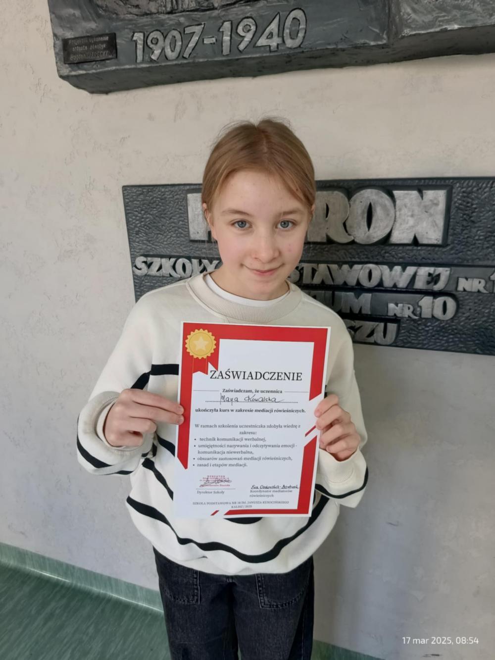 Pani wicedyrektor Dorota Paszek pogratulowała dziewczynom zdobycia umiejętności, ale przede wszystkim zaangażowania i chęci pomagania zwaśnionym stronom.