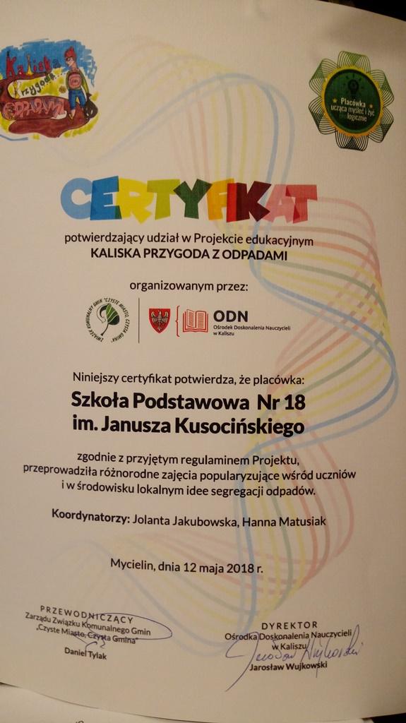 Podczas XX Rajdu Ekologiczno-Przyrodniczego w Mycielinie odbyło się podsumowanie Projektu oraz wręczenie certyfikatów, potwierdzających przeprowadzenie różnorodnych zajęć popularyzujących wśród uczniów i w środowisku lokalnym idee segregacji odpadów.