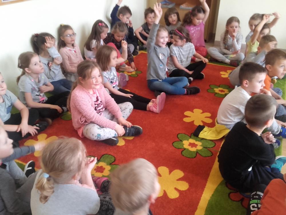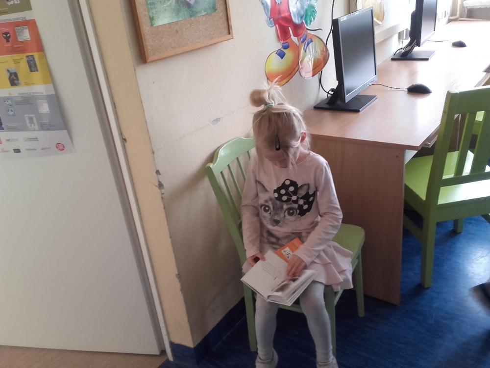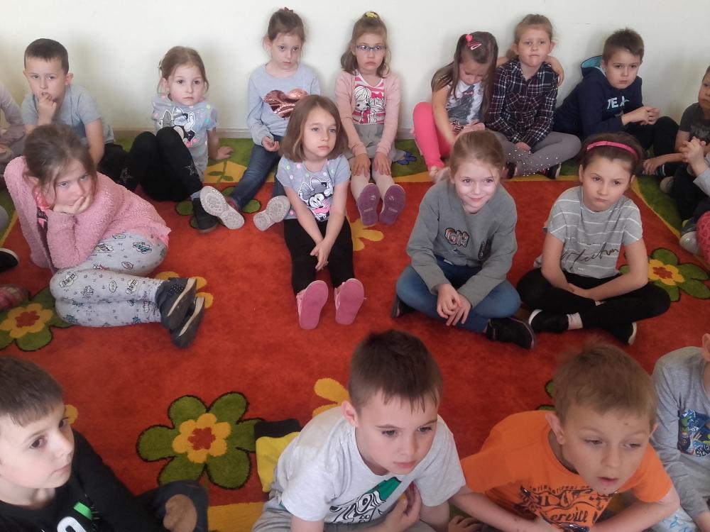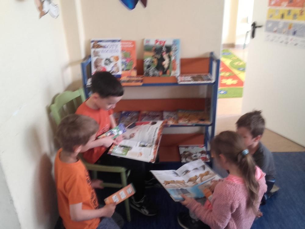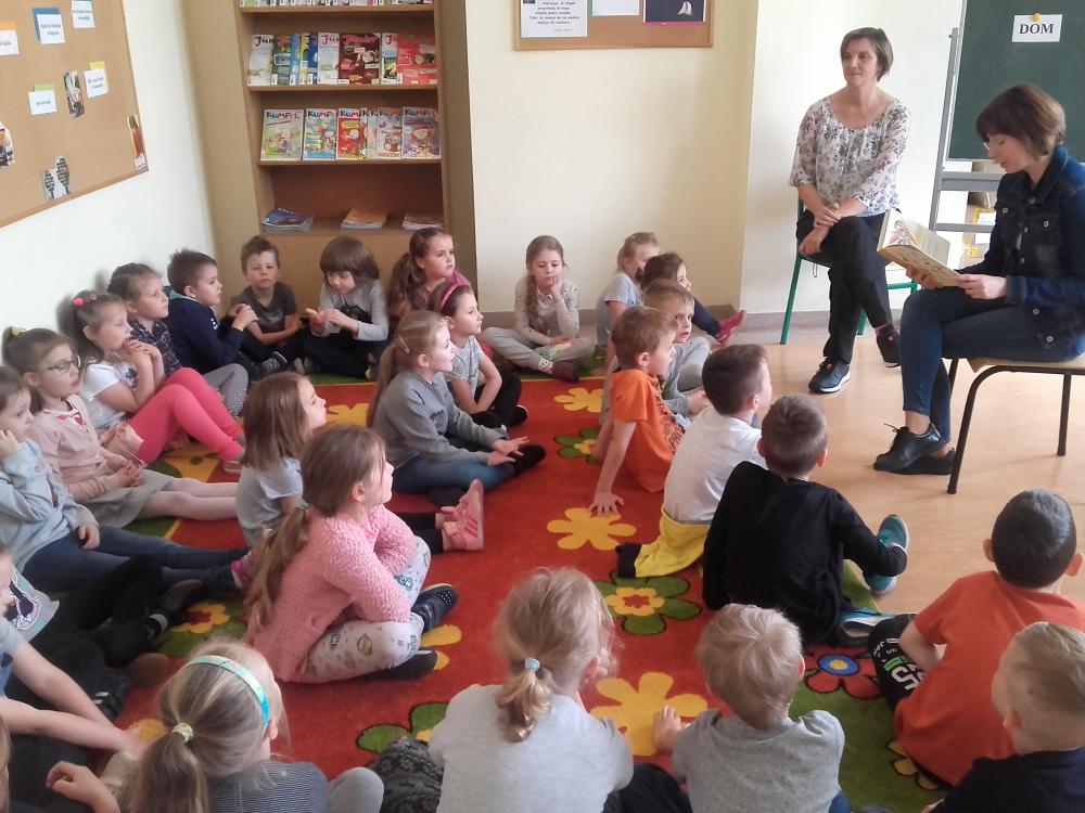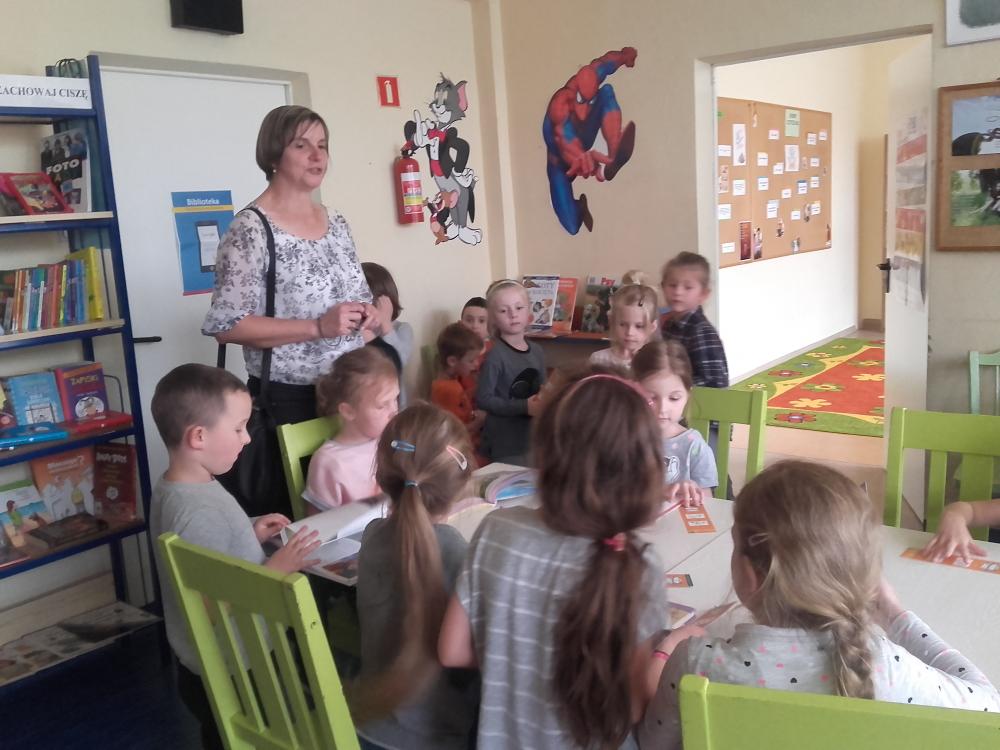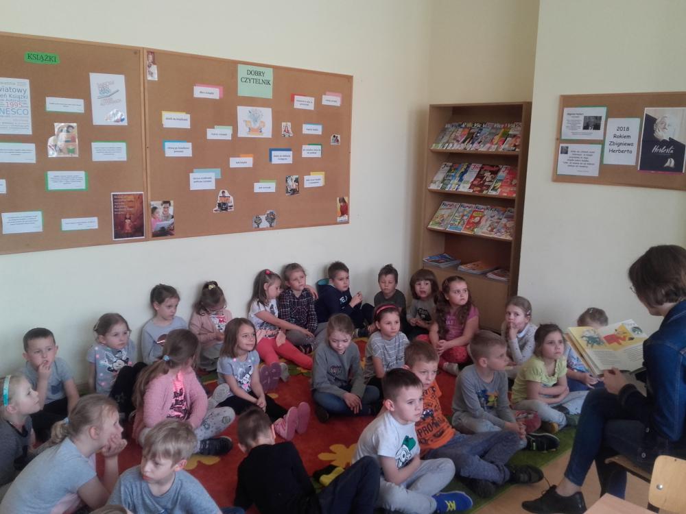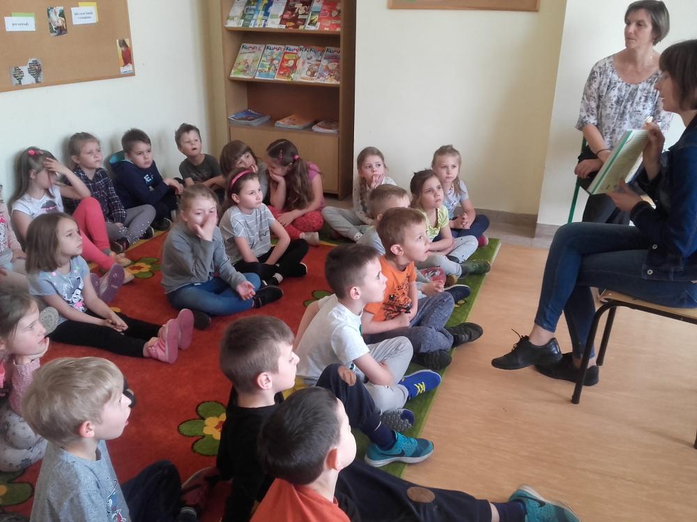 Dzieci wysłuchały fragmentu książki Justyny Bednarek "Niesamowite przygody dziesięciu skarpetek (czterech prawych i sześciu lewych)". Przedszkolaki wykazały się znajomościom bajek i baśni rozwiązując zagadki- odgadując postacie z bajek. Dzieci pierwszy raz gościły w bibliotece szkolnej, poznały zasady zachowania i wypożyczania książek. Dowiedziały się jak należny dbać o książki, żeby jak najdłużej nam służyły. Przedszkolaki z dużym zainteresowaniem i radością przeglądały nasze zbiory. Niektórzy podjęli nawet próbę samodzielnego przeczytania fragmentu wybranej książki. Na zakończenie spotkania przedszkolaki otrzymały pamiątkowe zakładki do książki.