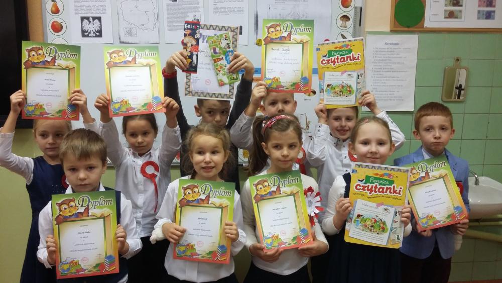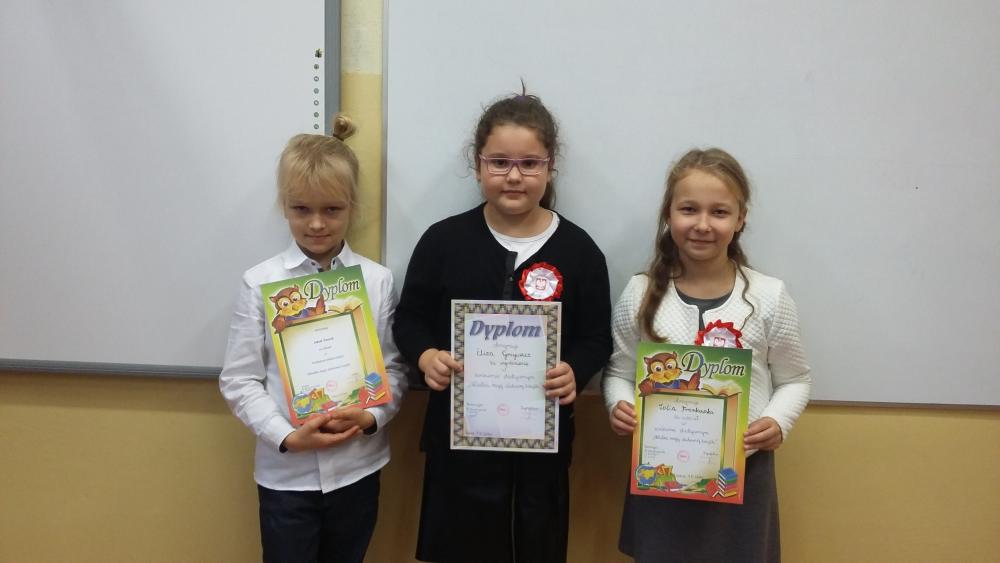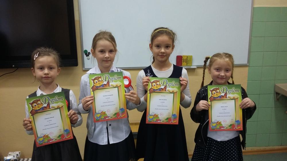W piątek 9 listopada wręczono dyplomy i nagrody książkowe uczniom, którzy zdobyli l, ll, lll m-ce oraz wyróżnienia w konkursie plastycznym "Okładka mojej ulubionej książki".