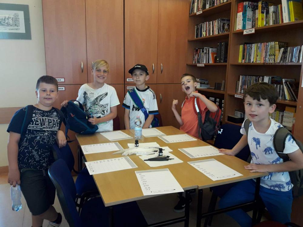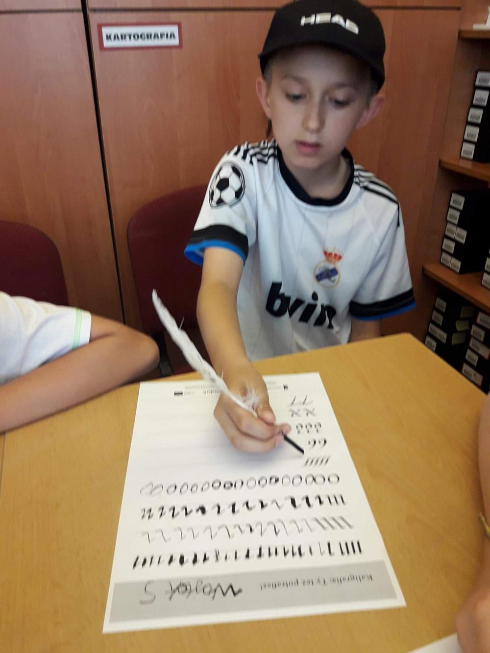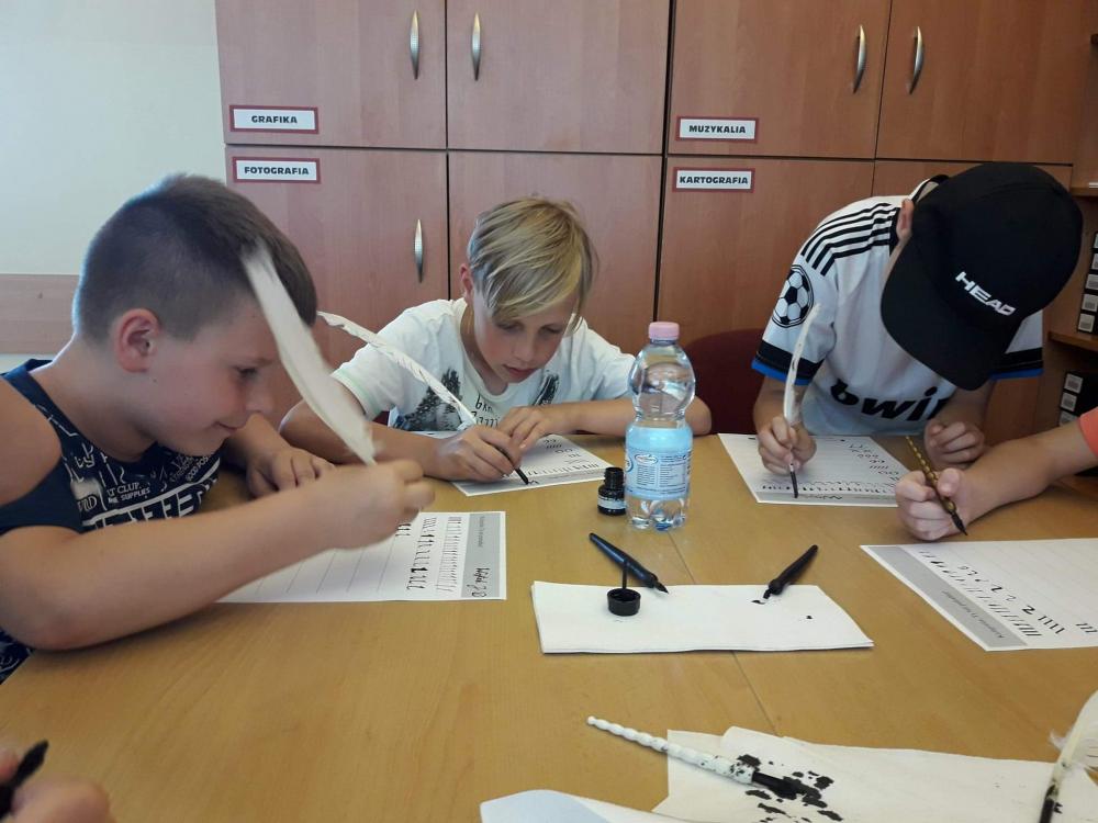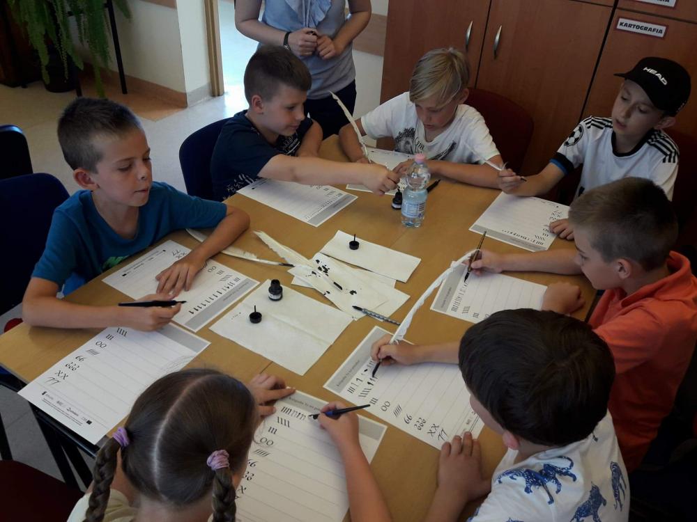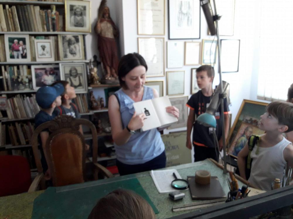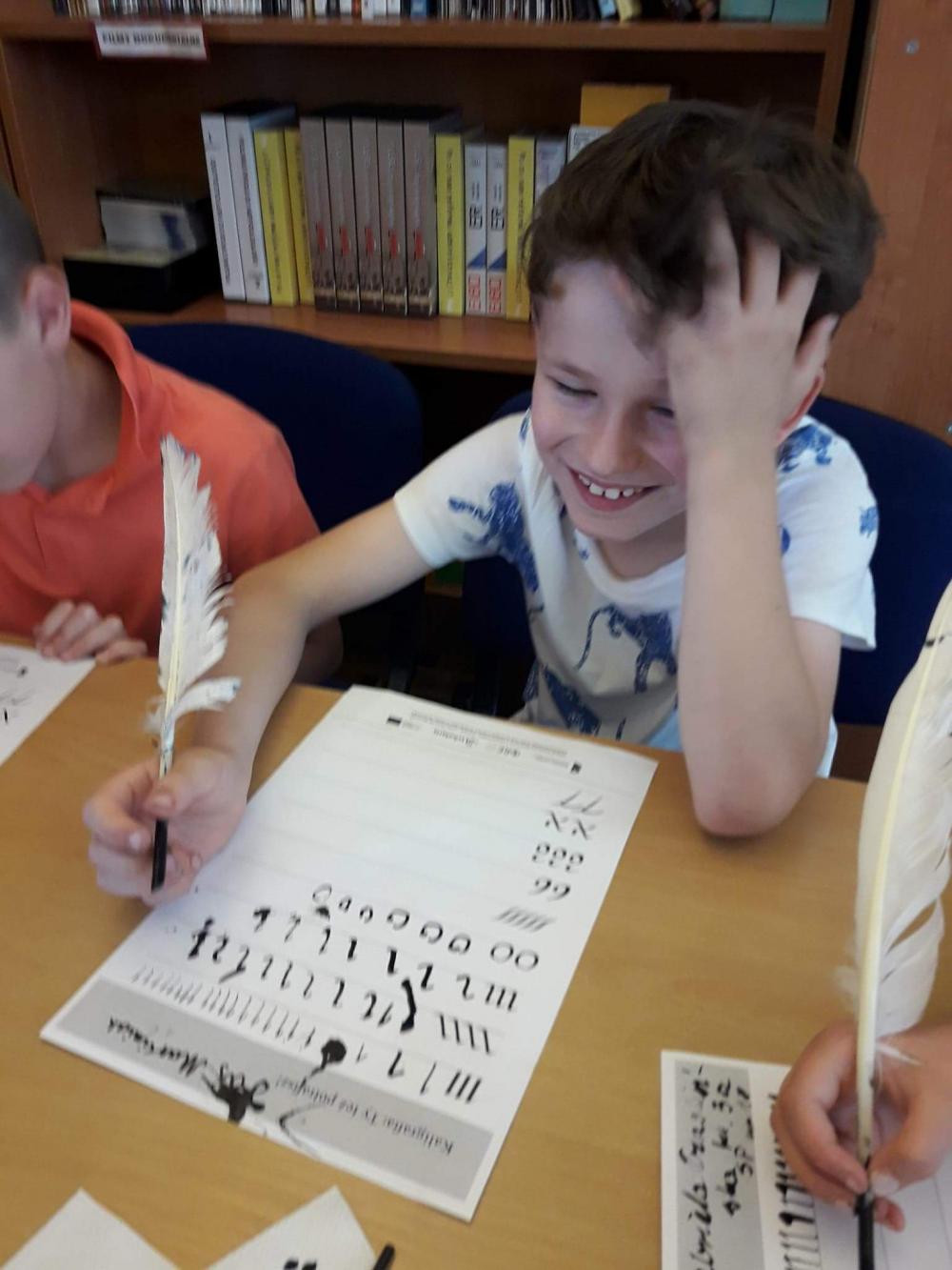 Podczas warsztatów dzieci miały okazję poznać techniki kolażu i pantomimy pracując indywidualnie i w zespole. Uczniowie wzięli udział w lekcji kaligrafii pisząc gęsim piórem i stalówką. Mieli również sposobność zapoznania się z księgozbiorem biblioteki. Zostały im zaprezentowane najstarsze, jaki i najmniejsze woluminy. Nasze pociechy odwiedziły także Pracownię Artystyczną Władysława Kościelniaka.