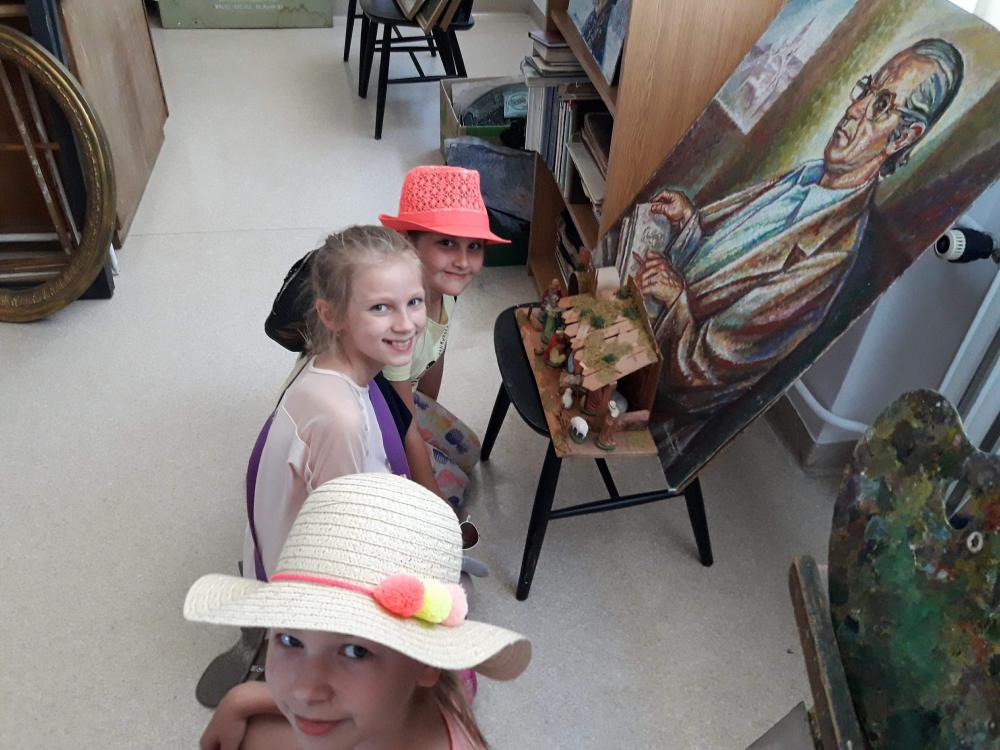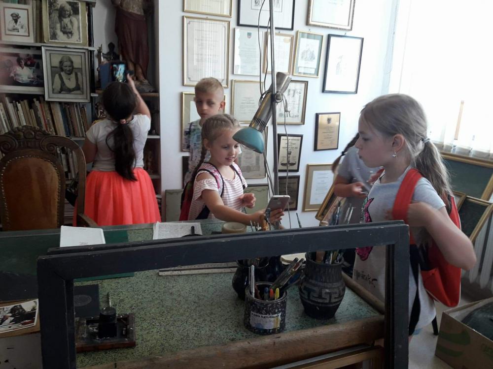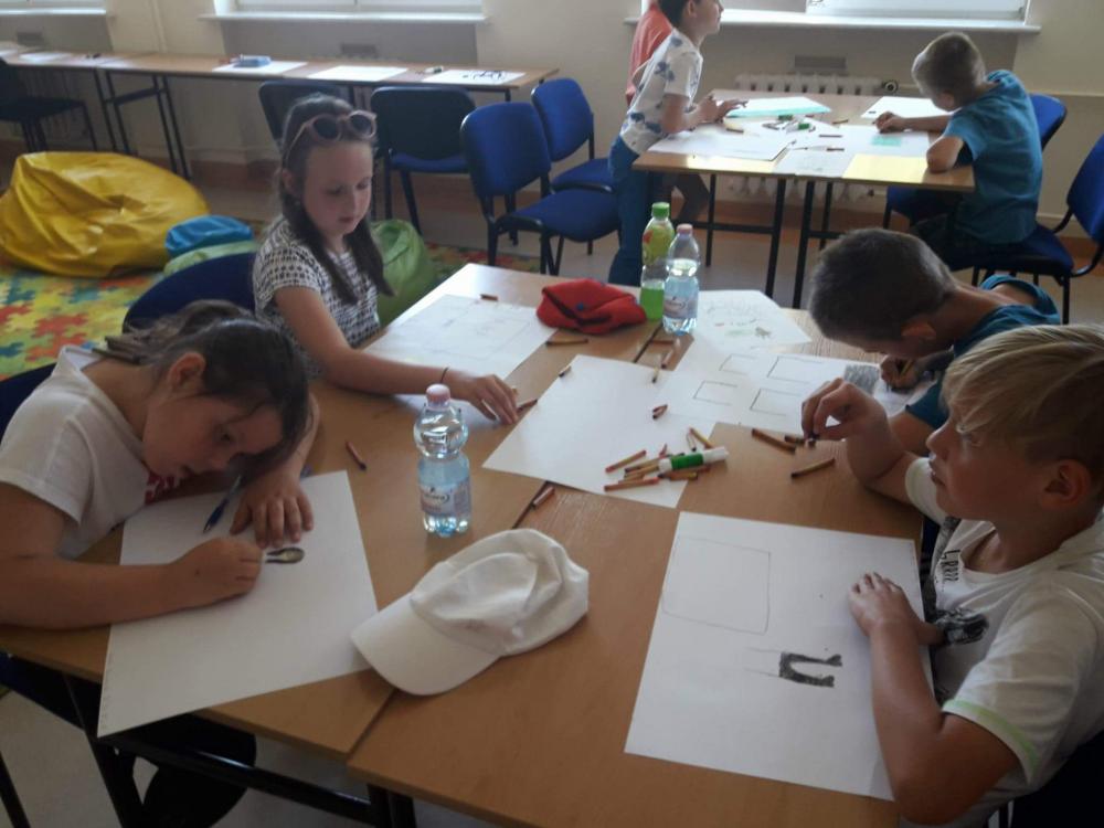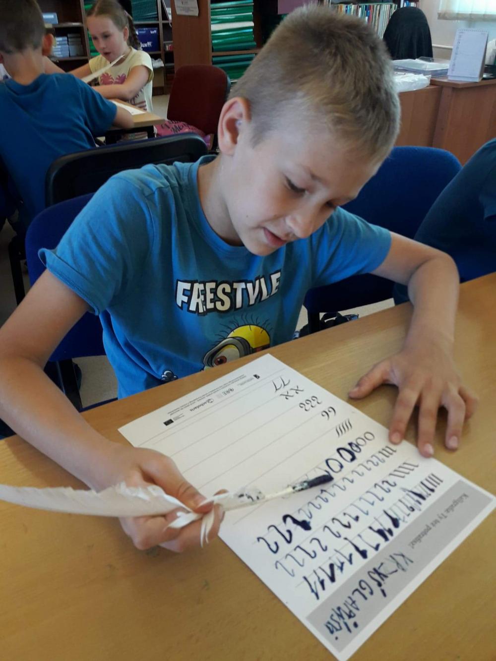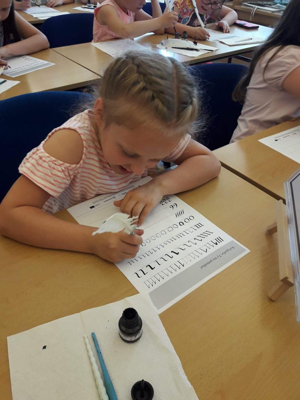 Podczas warsztatów dzieci miały okazję poznać techniki kolażu i pantomimy pracując indywidualnie i w zespole. Uczniowie wzięli udział w lekcji kaligrafii pisząc gęsim piórem i stalówką. Mieli również sposobność zapoznania się z księgozbiorem biblioteki. Zostały im zaprezentowane najstarsze, jaki i najmniejsze woluminy. Nasze pociechy odwiedziły także Pracownię Artystyczną Władysława Kościelniaka.