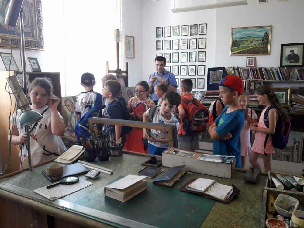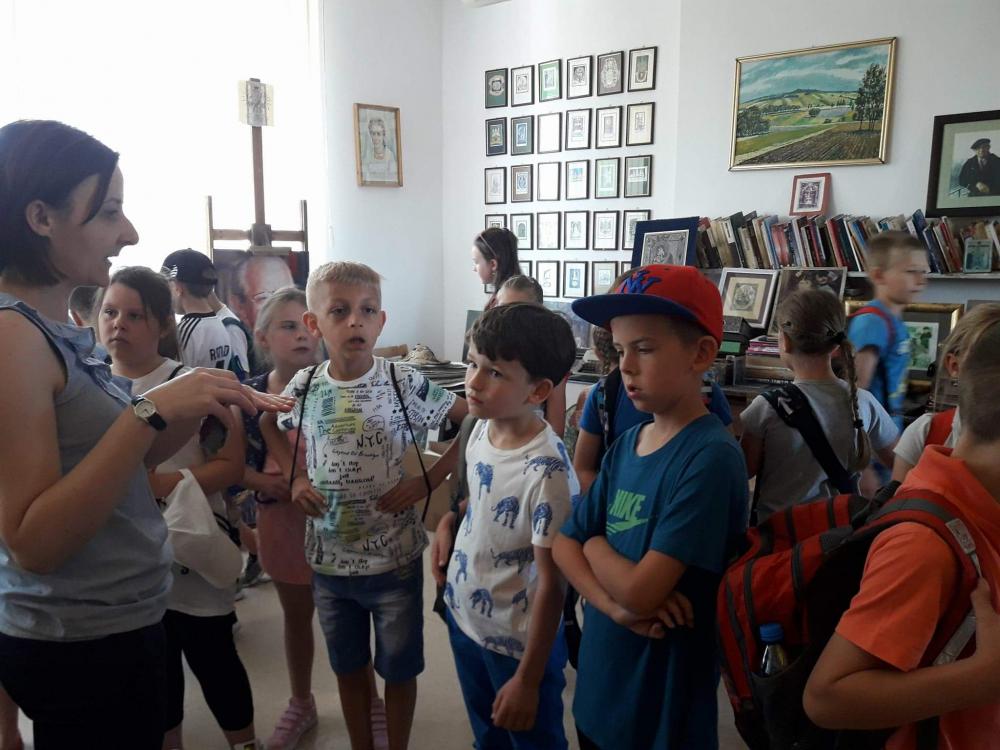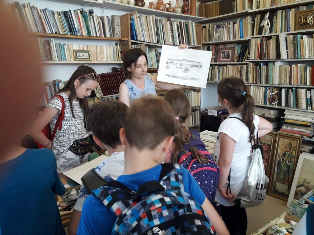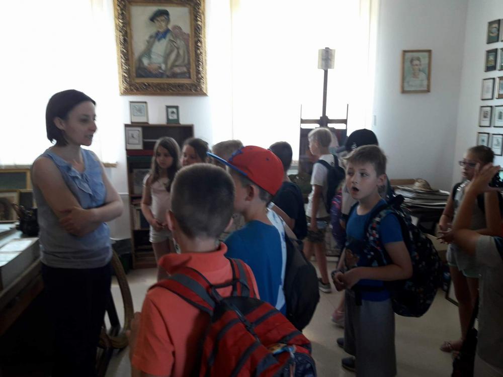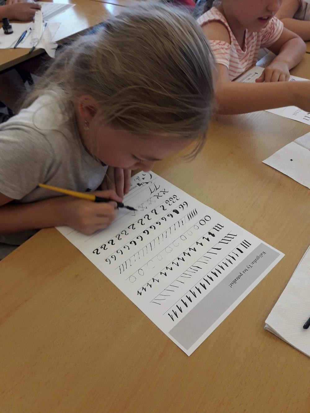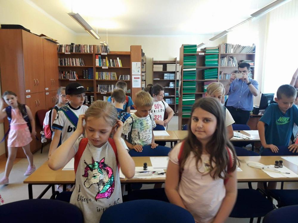 Podczas warsztatów dzieci miały okazję poznać techniki kolażu i pantomimy pracując indywidualnie i w zespole. Uczniowie wzięli udział w lekcji kaligrafii pisząc gęsim piórem i stalówką. Mieli również sposobność zapoznania się z księgozbiorem biblioteki. Zostały im zaprezentowane najstarsze, jaki i najmniejsze woluminy. Nasze pociechy odwiedziły także Pracownię Artystyczną Władysława Kościelniaka.